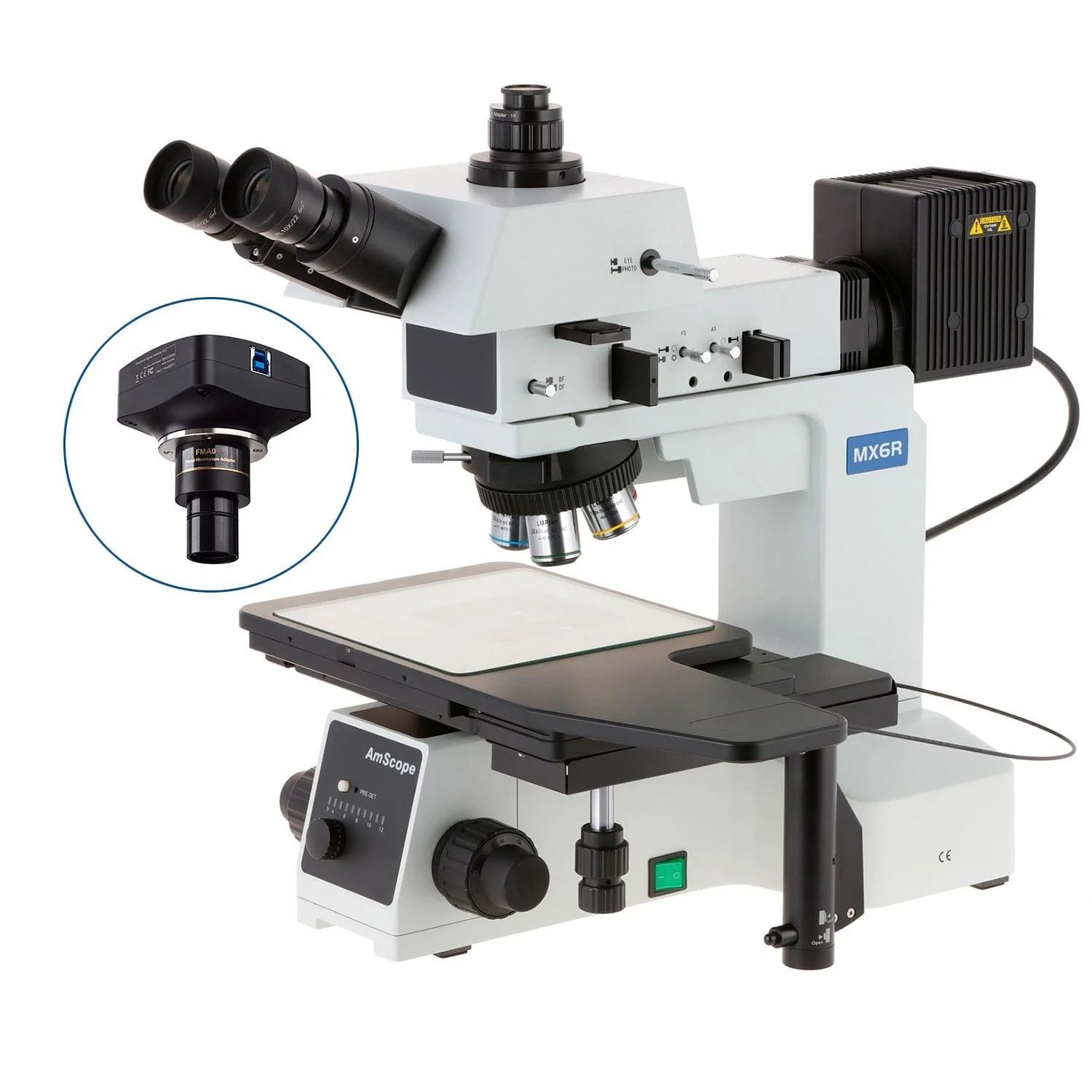 AmScope ME600 Series Large-Format Stage Brightfield and Polarizing Metallurgical Upright Trinocular Compound Microscope with Additional 100X Objective Lens and Optional Digital Camera
