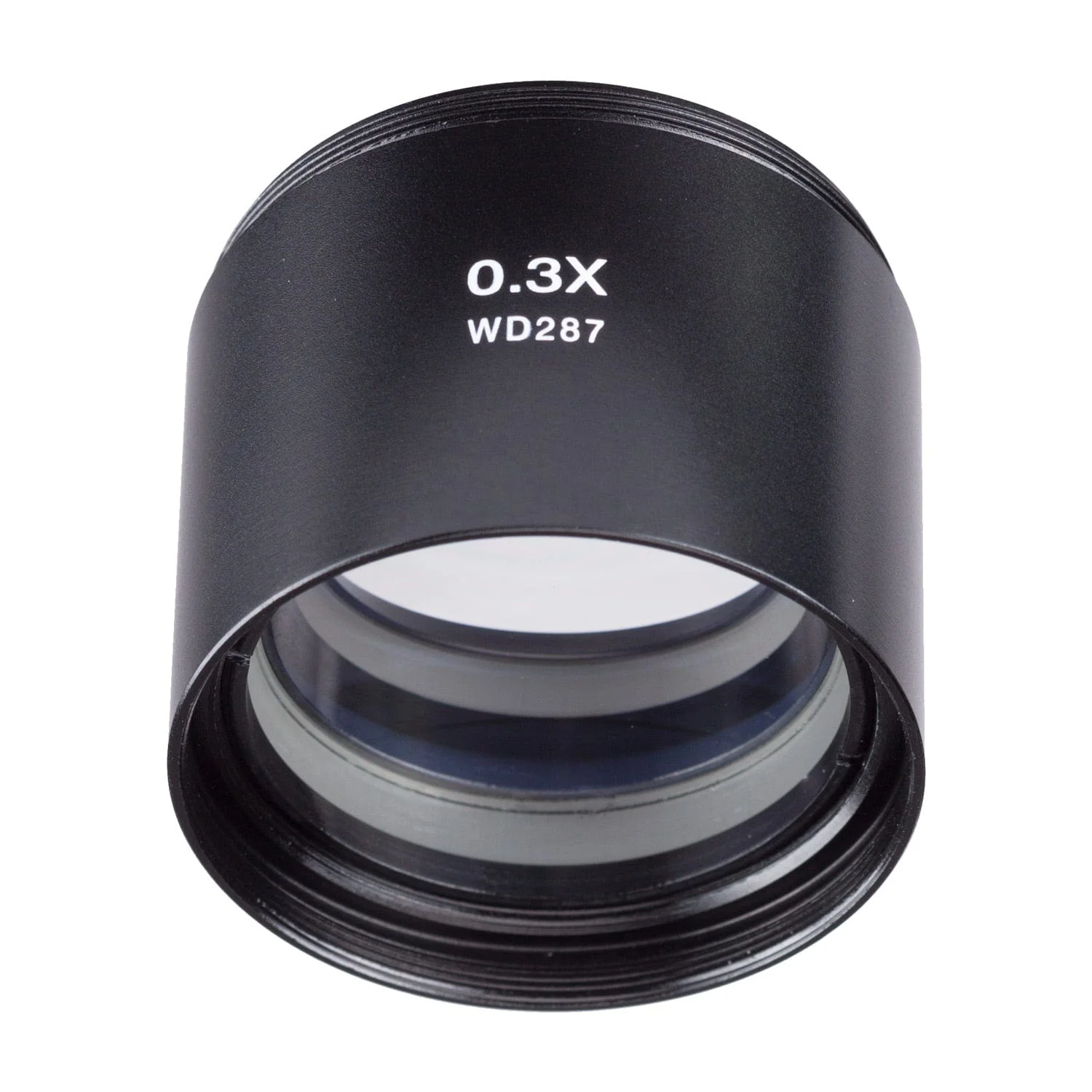 This is a 0.3X Barlow (auxiliary objective) lens for stereo microscopes with 48mm threading. It modifies the microscope's magnification by 0.3X to increase the field of view by roughly 3X, and increases the working distance to a maximum of 287mm (11.3in). The mounting thread is 48mm, compatible with AmScope SM, SW, and ZM series stereo microscopes. Due to the large working-distance, this Barlow lens is only intended for microscopes which support appropriate height-adjustment.